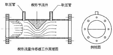 楔式流量计的基本流量方程式来自于帕努利原理(能量守衡和连续方程),通过楔块产生差压,该差压正比于质量或体积流量。楔式流量计的检测件是一块纵截面成 V 型的节流件,安装在管道的上部,它的圆滑顶角朝下,这样有利于含悬浮颗粒的液体或粘稠液体及脏污介质顺利通过, 不会在节流件上游侧产生滞流。当流体通过楔块时,由于楔块的节流作用,将会在楔块的上下游产生差压,该差压与质量或体积流量成正比。通过与差压变送器连接,测得差压从而获得流量值。对同一管径,不同的楔比 H/D(楔块开口高度 H 和管道直径 D 之比)可得到不同的典型流量范围,可应用于困难的流量测量,并保证精确可靠的测量结果。