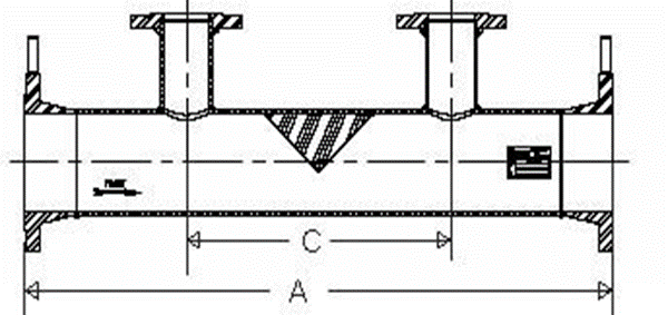 7. 楔式流量计的上、下游要带有一定长度的没有阻力的直管段。下游小直管段长度为安装管段直径的六倍;上游小直管段长度取决于楔比、直管段前阻力件的类型的管道的直径。(A、B 是指到楔形节流件的距离,产品出厂时节流件在流量计的中间。)