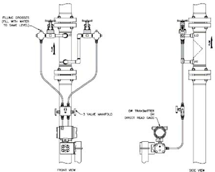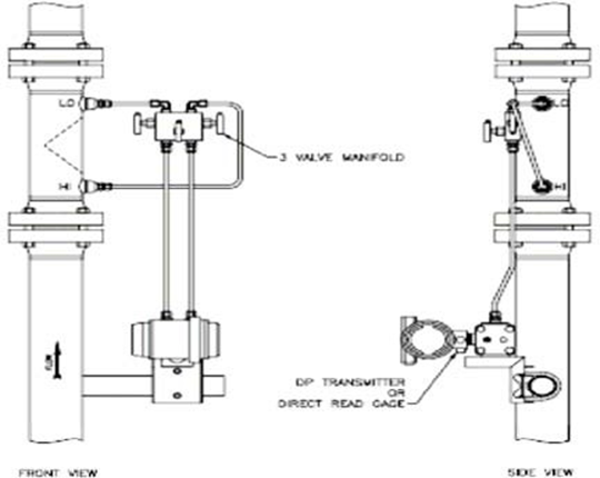 对于液体的应用:取压口位置建议水平或向下倾斜,变送器推荐安装在与流量计水平或低于流量计的位置,如下图所示: