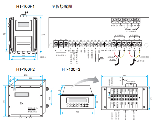 HT-100S经济型超声波流量计是将主板和磁性4按键封装到一个密闭壳体中。工作电源为单一隔离24VDC,标准隔离RS485输出,只保留流量测量功能,其它如模拟输入、模拟输出等功能需要通过主板上的串行扩展接口外挂功能扩展板才能实现。本主板除适合作为低成本流量变送器外,还适合作为多通道超声波流量计的一个通道板。